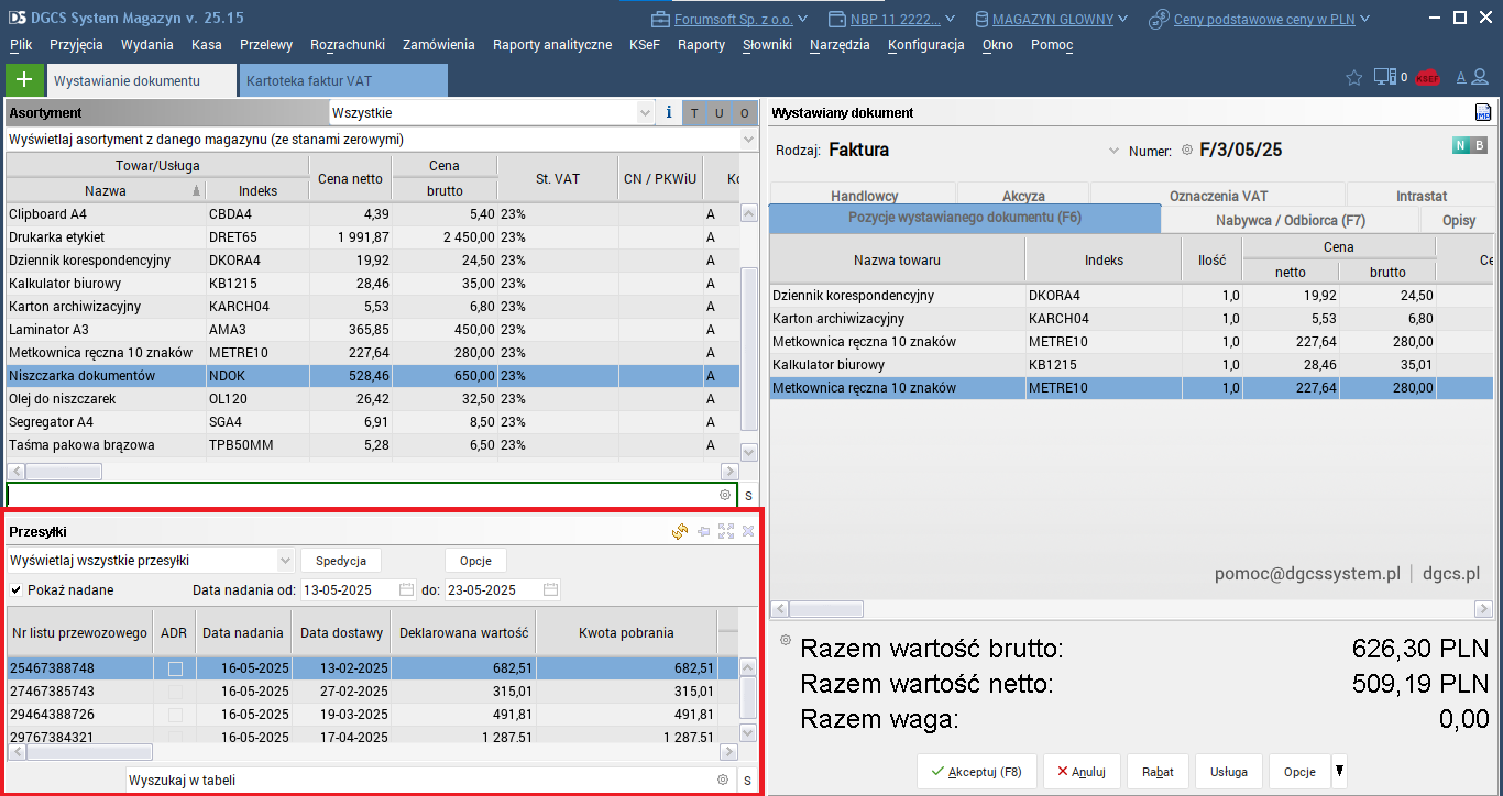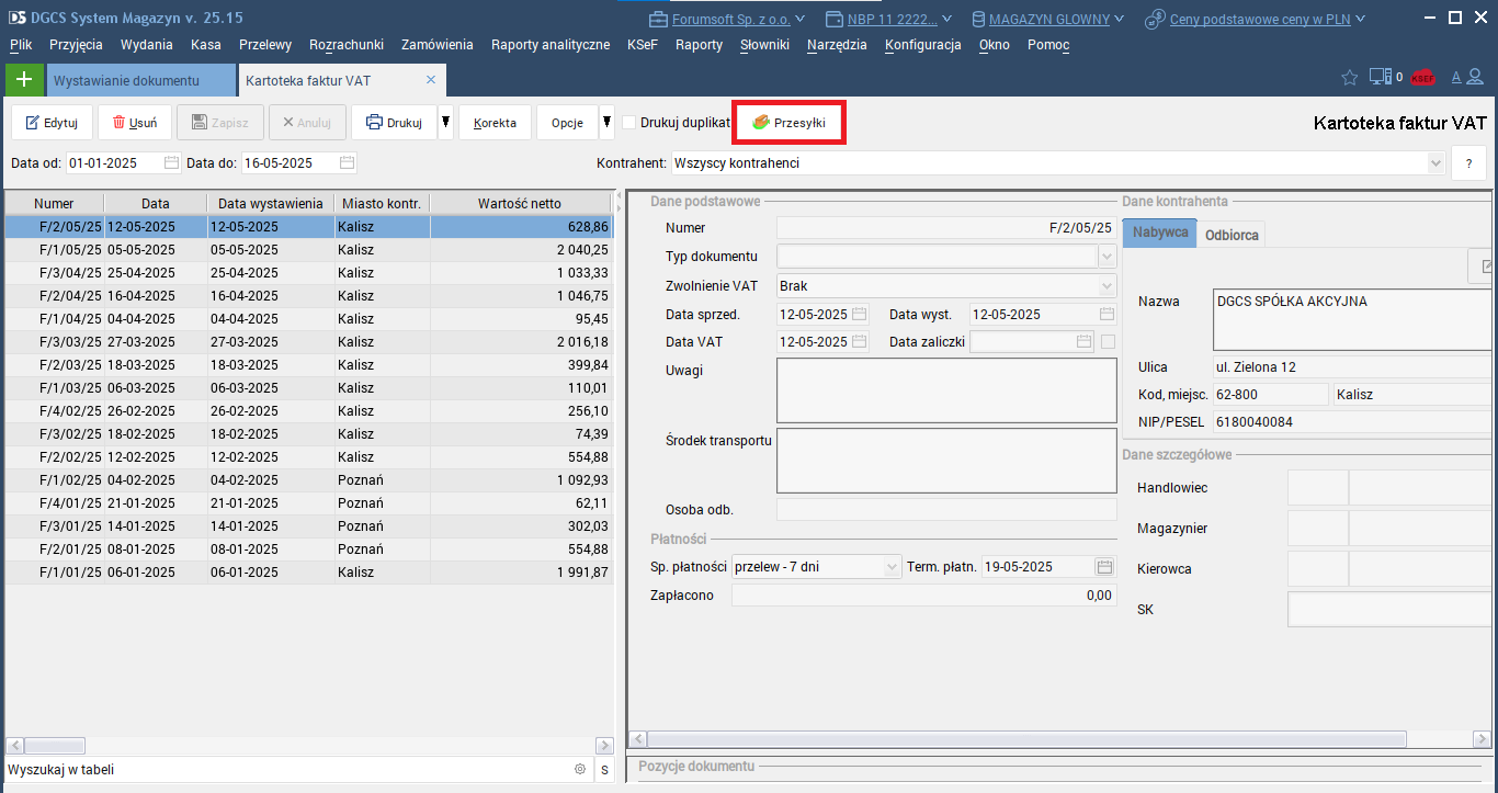Generowanie przesyłek z poziomu kartotek dokumentów wydań, w przykładzie dla kartoteki faktur VAT.
